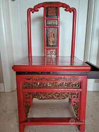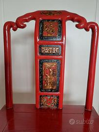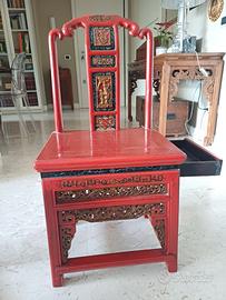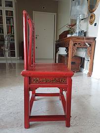 N.2 SEDIE CINESI LACCATE ROSSE, INTARSI ORO E NERO, CON CASSETTI LATERALI (altezza cm 42, seduta cm 40x34). CONSEGNA GRATUITA ALL'INTERNO DEL GRA (ROMA)