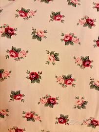 Splendido set di 2 tende english style in cotone battuto e con stampa rose +2 embrasse nello stesso materiale e fantasia+ 1 porta cuscino a cilindro. Ideale per una camera da letto o per un soggiono accogliente. Fatte a mano ancora da sartina di in tempo, ha un orlo che consente anche l’allungamento o taglio per ricavare cuscino