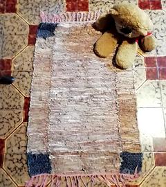 N 2 tappeti etnici artigianali lavorati con strisce in vilpelle intrecciate. Misura cm 80 per cm 65 circa. In regalo un terzo tappeto che presenta qualche segno di usura (ultima foto)