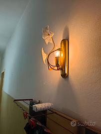 lampada da parete (applique) realizzata in vetro di Murano, caratterizzata da un design floreale con elementi in vetro a forma di fiore montati su una struttura metallica. Materiali:Vetro di Murano lavorato artigianalmente e struttura in metallo (spesso con finiture dorate o metalliche). Stile:Design artistico, tipico della tradizione vetraria veneziana, che unisce l'estetica classica a forme naturali come i fiori. Utilizzo:Ideale per illuminare e decorare le pareti di ambienti interni, conferendo un tocco di eleganza e prestigio.