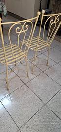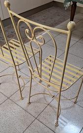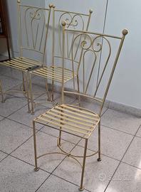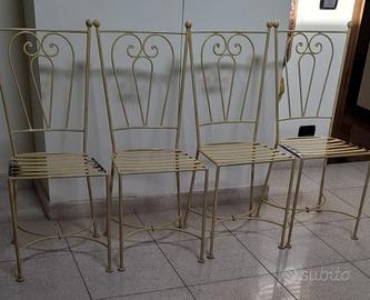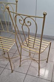 Set composto da n.4 sedie da interno in ferro battuto realizzate artigianalmente con schienale con decoro. Colore beige. N.2 sedie sono state saldate nella seduta e sono riconoscibili da colore scuro del ferro nelle attaccature. Se le sedie sono usate senza cuscini necessita dipintura nella parte interessata dal rinforzo. L altezza da terra allo schienale e' di cm 94. L altezza da terra alla seduta di cm44. La larghezza massima della seduta e' di cm38 e la minima cm31 (vedi foto seduta) Se interessano sono disponibili n.6 cuscini NUOVI a quadretti bianco rossi con laccetti ad euro 30 complessivi. Non è possibile la spedizione. Ritiro a Padova zona Santa Croce.