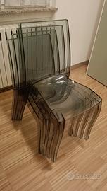 N. 4 sedie trasparenti. Usate ma tenute bene. Su ogni sedia in alto sullo schienale si è formata una riga (vedi foto 6) Solo ritiro a mano, no spedizione. Si vendono solo in blocco.