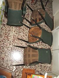 Nr. 5 sedie in massello di legno pesante e pieno e pelle verde fissata con chiodi da tappezziere perché fatta artigianalmente negli anni 40. Hanno laseduta con le molle e sono coperte da tela di canapa. La seduta, sotto, è da riparare come da foto, ma non sono tarlate. Sono in discrete condizioni. Disponibili, per inutilizzo, 4 sedie per la cucina in paglia e legno, 2 sedie stile Shabby diverse e 6 sedie diverse tra cui 1 in legno pieghevole, 1 sedia stile rustico, 1 salotto formato da 1 parete attrezzata, 1 tavolino e 4 mensole