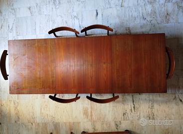 6 sedie come da foto , recentemente restaurate,si apre fino a 260cm, alto 70 cm e largo165cm e' un tavolo elegante scandinavo piano in teak e gambe in rovere