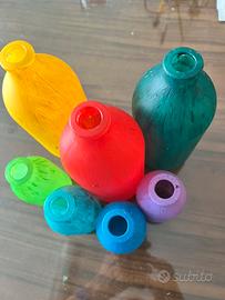 Set di 7 bottiglie di vetro dipinte a mano, dai colori vivaci e allegri. Perfette come vasi o elementi decorativi. Sono in ottime condizioni, senza scheggiature o graffi.