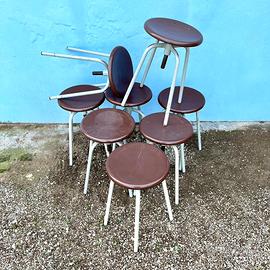 N.8 sgabelli anni 70 regolabili in altezza, un classico intramontabile dei laboratori scolastici, con struttura in metallo e seduta in materiale plastico. In buone condizioni come da foto, presenti inevitabili segni di utilizzo.