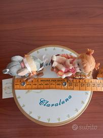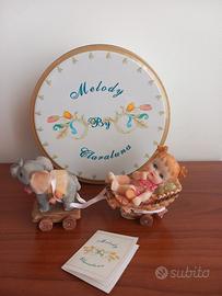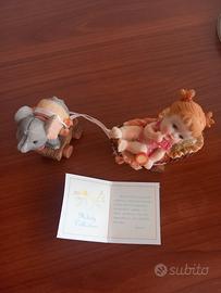 9 bomboniere Claraluna adatte per nascita o battesimo, di cui 8 con bambina su un carretto trascinato da un elefantino e 1 con una bimba sul carretto trascinato da un cagnolino(lupacchiotto). Ogni bomboniera ha la sua scatola di latta. Se avete richieste, ad esempio non volete l'unica bomboniera con il cagnolino, chiedete.