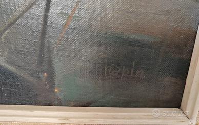 olio su tela della metà del XX secolo (anni '50/'60), firmato in basso a destra "Napin". Scorcio portuale con barche a vela in primo piano e un borgo antico con cupola sullo sfondo. Misure 45*36 (cornice 59*49)