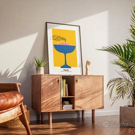 Scopri questo splendido poster artistico su Napoli, un'opera di arte moderna e design minimalista che cattura l'essenza della città partenopea. Il poster raffigura una silhouette stilizzata del Vesuvio in una coppa, evocando il legame tra la terra e il mare, due elementi iconici della cultura napoletana. Lo sfondo giallo vivace richiama il calore del sole del Mediterraneo, mentre il contrasto con il blu profondo rappresenta il mare e la tradizione marittima della città.