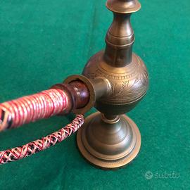 Narghilè in ottone. Oggetto d’arredamento noto anche come shisha o hookah. È un tipo di pipa ad acqua utilizzata per fumare tabacco aromatizzato. Il termine "shisha" deriva dal persiano per vetro, mentre "narghilè" deriva dall'indiano per noce di cocco. Modello in ottone con dettagli in legno sul fusto e sul tubo. Il tubo è avvolto in un tessuto decorativo rosso, nero e bianco. Oggetto usato da secoli in Medio Oriente e Asia. Dichiarazione di non responsabilità: L'uso del tabacco e del narghilè è dannoso per la salute e crea dipendenza.