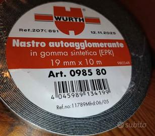 Vendesi nastro autoagglomerante Wurth in gomma sintetica (EPR), nuovissimo, misure 19 mm x 10 m, ripara immediatamente fori, falle e incrinature di tubi e manicotti, idoneo anche per cavi di potenza, ricostruendo l’isolamento esterno.