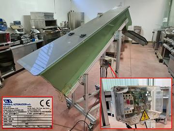 nastro caricatore usato per cosmetici, si tratta di un elevatore carrellato in acciaio verniciato, regolabile in altezza e inclinazione. di marca General Automation modello STO49 del 2002. non è adatto per alimenti, ma è predisposto per essere sincronizzato con altri macchinari. si consiglia un'accurata pulizia e lubrificazione prima dell'utilizzo definitivo.