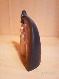 Piccola statuina raffigurante la Natività in chiave moderna e stilizzata. Linee essenziali e profilo armonioso rendono l’oggetto un elegante complemento d’arredo, oltre che simbolo cristiano. La coda della stella, finemente suggerita dalla linea morbida che definisce il contorno della capanna, è accentuata da una delicata striscia blu che, partendo dalla parte anteriore, sembra allacciarsi alla forma stessa, avvolgendo la parte retrostante come un mantello notturno, mentre all’interno spiccano i rilievi di Maria, Giuseppe e il Bambino. Colore tortora, con atmosfera sobria e raffinata.