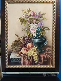 bellissima natura morta con fiori e frutti , olio su tela mis 50x 70 completa di cornice in legno lavorato