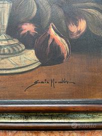 Elegante natura morta a olio su tela, raffigurante una composizione classica con alzata in metallo e frutta, pere, uva, melograno, fichi, su fondo scuro.