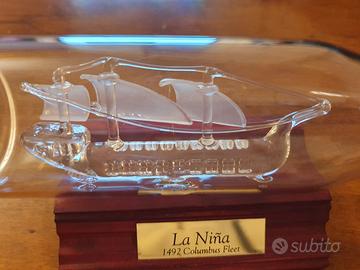 Una delle caravelle di Cristoforo Colombo, la Nina, in bottiglia. Nuova. Lavorazione in vetro a lume. Basamento in legno con targhetta dorata. Dimensioni: 19 x 5 cm. Scatola originale.