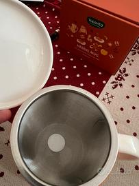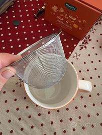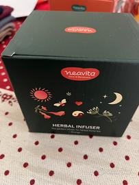 Vendo tazza per infuso Neavita, nuova, perfetta, mai utilizzata, completa di scatola, colino per tisana e coperchio. Bellissimo colore arancione con disegni di frutta e di fiori
