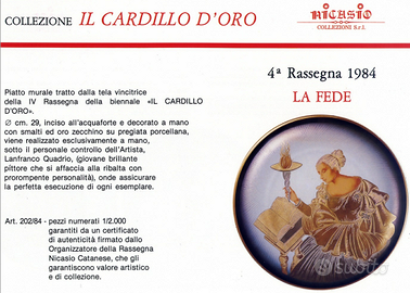 Questi piatti murali, diametro 29 cm, incisi e decorati con smalti e oro zecchino su pregiata porcellana, vengono realizzati esclusivamente a mano, sotto il personale controllo dell'artista, onde assicurare la perfetta esecuzione di ogni esemplare.