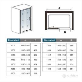 Box Doccia ancora imballato (NUOVO, MAI USATO) dimensioni 110x195 cm (PIATTO DOCCIA NON INCLUSO) Caratteristiche Tecniche: Vetro Temperato da 8 mm; Trattamento easy clean anticalcare; Porta scorrevole fluida e solida; Apertura laterale grande spazio d’ingresso; Ruote a vista; Profili e Telai in alluminio cromato lucido; Installabile su tutti i tipi di piatti doccia con bordo piatto; Prodotto Reversibile verso da scegliere in fase di installazione; Montaggio semplice e veloce grazie al libretto di istruzioni con immagini esplicative; Ampia regolazione della porta (visionare la scheda tecnica nella galleria fotografica); Viti in acciaio inox, anti ruggine e di lunga durata; Guarnizioni in PVC realizzate con tecnologie innovative; Piatto doccia non incluso; Prodotto certificato CE secondo il nuovo Regolamento Europeo 305/2011.