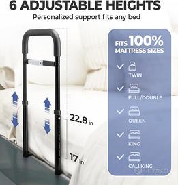 Informazioni su questo articolo Supporto letto compatto e affidabile: fornendo un supporto stabilizzante, la sponda letto compatta nimood è perfetta per anziani e persone con mobilità ridotta. La sponda letto compatta consente alle persone di sedersi e alzarsi in modo indipendente con maggiore facilità, riducendo al minimo il rischio di cadute e nuovi infortuni Dotato di illuminazione di movimento: la luce di movimento in dotazione consente di illuminare l'ambiente circostante quando ci si alza di notte, in modo da non dover preoccuparsi di inconvenienti al buio. Basta rimuovere la lampada e si illuminerà ovunque si vada. Non preoccuparti di accendere le luci e disturbare i familiari che riposano intorno a te Impugnatura ergonomica imbottita: l'impugnatura imbottita in schiuma è angolata di circa 30 gradi rispetto alla posizione di sonno. Questo design ergonomico può modificare la direzione della forza del polso per ridurre la forza necessaria per gli utenti in posizione di sonno quando si alzano. Un'impugnatura curva aiuta anche a mettersi a letto modificando la posizione di presa Installazione in un minuto senza attrezzi: viene fornita parzialmente preassemblata, quindi chiunque può installarla facilmente. Tutto ciò che serve è collegare i tubi e fissare la sponda al letto. Non sono necessari altri assemblaggi o utensili di alcun tipo La regolazione dell'altezza si adatta meglio a molti tipi di letto: la regolazione dell'altezza da 40 a 56 cm si adatta meglio ai materassi per una maggiore sicurezza e una vestibilità più personalizzata. può essere utilizzato su letti singoli, singoli XL, matrimoniali, queen e king size (non è consi