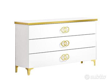 Finiture premium: ll comò a 3 cassetti e i comodini a 2 cassetti presentano un profilo superiore dorato e maniglie gioiello dorate con motivo a cerchi intrecciati, garantendo una presa comoda e un’estetica ricercata.