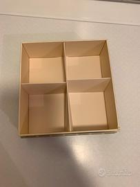 Scatola a forma quadrata 13x13 cm, con un angolo un po' rovinato.