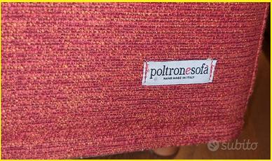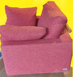 Struttura in legno, imbottitura in piuma sintetica, rivestimento in stoffa color rosso mattone e piedi in legno.