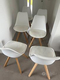 Nr. 6 sedie da pranzo marchio JYSK (attualmente in vendita presso i negozi) con seduta sagomata bianca e cuscino fisso coordinato in similpelle. Gambe in legno massello.