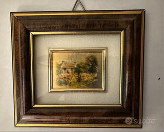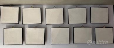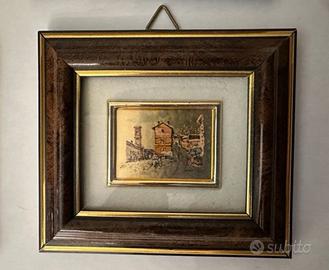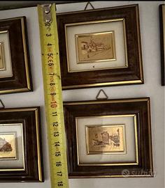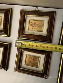Nr10 quadretti doppio passpartout dorati e paesaggi vari su lamina dorata. Tutti con gancio per appendere a parete. Dimensioni 9x10 cm. Come nuovi.