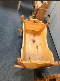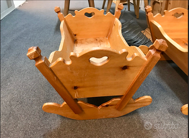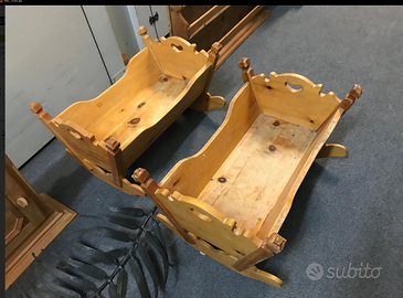 Causa trasloco SVENDO nr2 culle a dondolo realizzate artigianalmente in legno di rovere, intarsiate originali AMPEZZANE/TIROLESI, adatte anche come portafiori o portariviste. Mis L60xL43xh38cm. CONDIZIONI: ottimo stato. Contestualizzazione ideale chalet/baita/casa montagna.