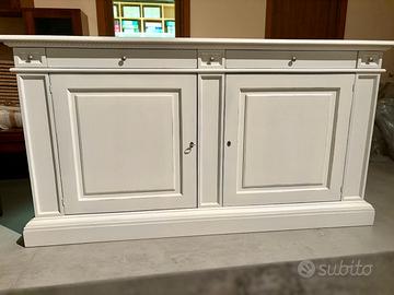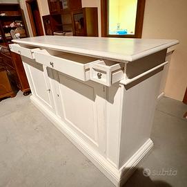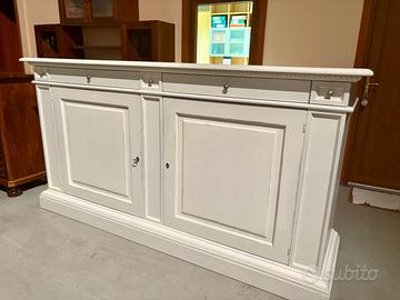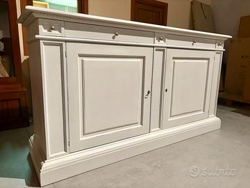 PROPONIAMO UN BELLISSIMO CREDENZONE CON 2 ANTE E 4 CASSETTI, I REALIZZATO DI VERO LEGNO MASSELLO IN FINITURA BIANCO LACCATO INVECCHIATO (BIANCO SCOPERTO-CONSUMATO).