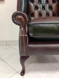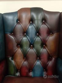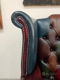 Originale e autentica poltrona chesterfield ( chester ) modello Queen Anne harlequin patchwork realizzata artigianalmente in Inghilterra secondo la tradizione chester inglese, con pelle bovina di pieno fiore tamponata e stonalizzata a mano.