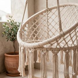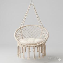 Vendo bellissima sedia sospesa a forma di poltrona, realizzata in corda intrecciata color beige/crema con la tradizionale tecnica del macramè.