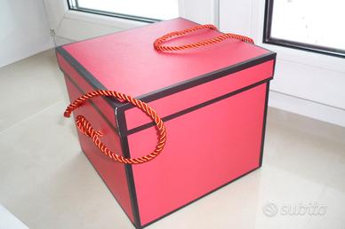 3 foto: scatola quadrata rossa resistente con manici, senza iscrizioni;