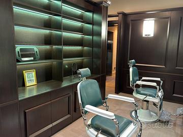 Vendiamo per mancato utilizzo barber shop completo di 2 poltrone in perfetto stile anni 50 con imbottitura in pelle verde inglese, 2 lavabi, 2 specchiere, scaffalature e armadiature come da immagini. Il barber era inserito in un contesto alberghiero ma non è stato mai utilizzato.