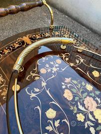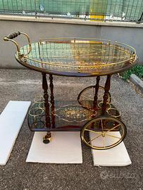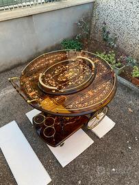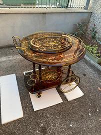 Carrello Bar Intarsiato. Due grandi ruote color oro in stile carrozza e 2 piccole ruote girevoli nella parte anteriore. Comprensivo di Vassoio.
