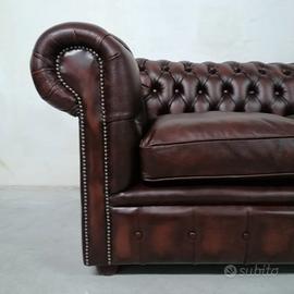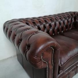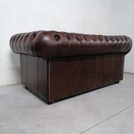 Nuovo divano 2 posti chesterfield modello club inglese originale in pelle bovina di pieno fiore marrone anticato ( Antique Brown ). Nella fodera sottostante il cuscino è cucito il certificato di autenticità. È disponibile in coordinato anche la poltrona singola club o Queen Anne e il poggiapiedi. Chesterfield inglesi realizzati artigianalmente in Inghilterra con pelle bovina di pieno fiore e con un telaio in legno massello di faggio. Il design classico e iconico del frontale, lo schienale trapuntato da una precisa lavorazione a capitonné fissata nel fondo dai bottoni tirati a spago, il battitacco decorato da una fila di bottoni, le borchie in metallo applicate singolarmente sui profili e i 2 cuscini bordati sulla seduta rendono questo sofà unico e inimitabile.