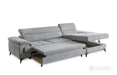 Divano con panchetta letto, poggiatesta reclinabili e dotato di un pratico contenitore integrato.