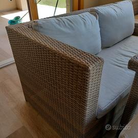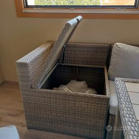 Set giardino in simil RATTAN composto da tavolo quadrato l.122 x h.72 x p.122cm, 2 divanetti l.145 x h.78 x p.80cm uno con poggiolo sx e uno con poggiolo dx, cubotto contenitore angolare fra divanetti l.80 x h.78 x 80cm , in più 2 pouff l.92 x h.42 x p.35cm, il tutto completo di cuscini in tessuto morbido e resistente