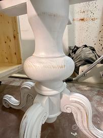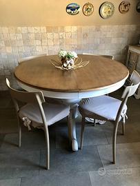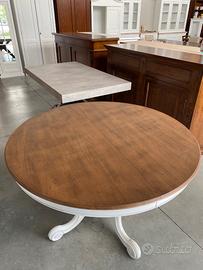 NUOVO BELLISSIMO TAVOLO ROTONDO ALLUNGABILE AL CENTRO, REALIZZATO DI VERO LEGNO MASSELLO IN FINITURA BIANCO SHABBY. Gamba sbiancata e spazzolata, piano caramello invecchiato, spazzolato e patinato.