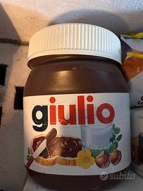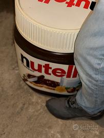 vendo fantastico barattolone della Nutella gigante personalizzato con il nome Giulio. Introvabile. mis. ca 60 di altezza (vedere foto in relazione alla gamba) per 45- 50 di larghezza- ottimo come puff, per stivare giocattoli, abiti, ecc. ha una leggera crepa sul bordo che però rimane coperta dal tappo.
