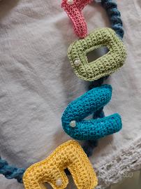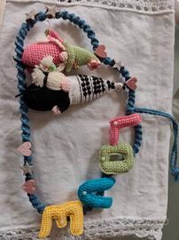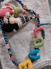 Piccola struttura a forma di nuvola ricoperta con lavorazione a macrame, su cui sono stati cuciti e incollati due gnomi Amigurumi e la scritta LOVE amigurumi.