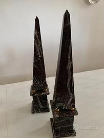 RARA COPPIA DI OBELISCHI IN MARMO BRECCIA MEDICEA CON PALMETTE IMPERO IN BRONZO DORATO , POGGIANTI SU QUATTRO SFERE IN BRONZO dorato.
