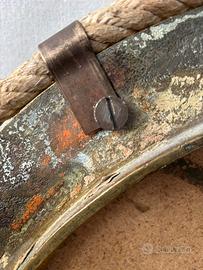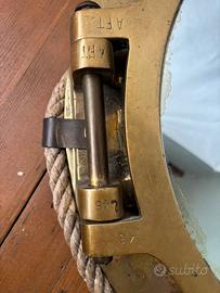 L’ottone presenta patina marina autentica con ossidazioni naturali, micro-pitting e tracce di primer rosso navale (minio), tipico delle costruzioni nautiche fino alla metà del Novecento.