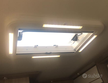 Grazie alla cupola piatta, il rumore di guida all'interno è molto basso. Il semplice utilizzo con una sola mano grazie all'impugnatura ad arco consente di posizionarlo con un angolo fino a 180°. Azionando il meccanismo di apertura, la cupola si blocca e si sblocca automaticamente. Il telaio esterno a doppia parete garantisce un migliore isolamento. Il telaio interno protegge in modo affidabile dai raggi solari e/o dagli insetti. Con illuminazione a 12V.