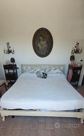 Oggetti di rame, macchina da cucire, padelle e pentole di rame, pendolo non funzionante. Più letto matrimoniale shabby con materasso nuovo.