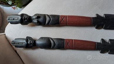 Oggetti in legno intagliato e dipinto a mano, acquistati al mercato di Nairobi. Fanno parte dell'artigianato tribale Masai. Vendo i pugnali a 20, il guerriero a 15. Tutti 2 insieme a 29 euro. In ottime condizioni. Dimensione di spedizione in base all'articolo