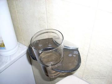 Vendo in blocco mensola sottospecchio, bicchiere portasapone e bicchiere porta spazzolini in cristallo marrone sfumato, con supporti per muro.