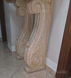 -Coppia di mensole/gambe per consolle in simil travertino scolpite a volute di acanto.