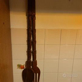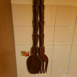 Set decorativo vintage in legno intagliato a mano, composto da un grande cucchiaio e una grande forchetta.